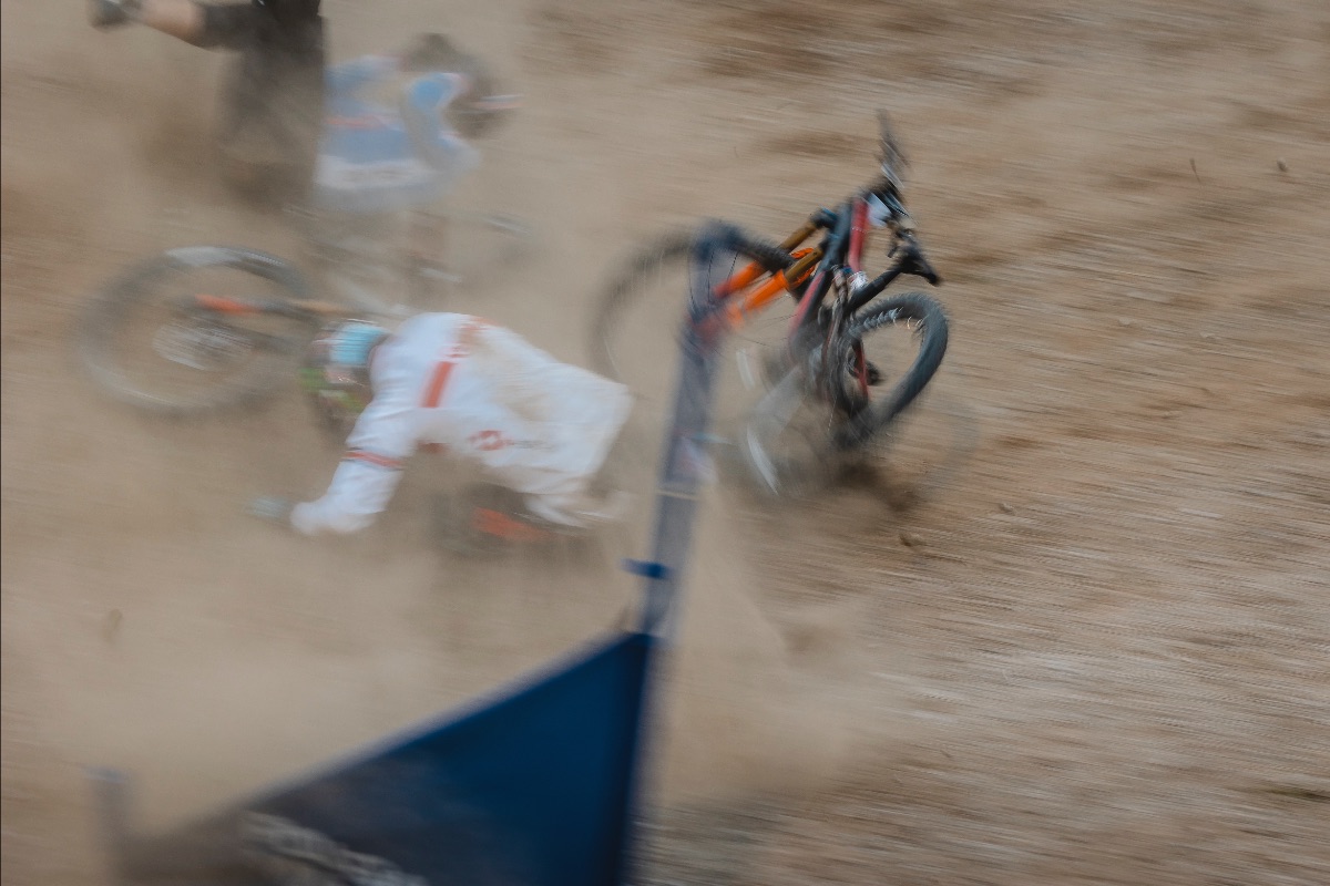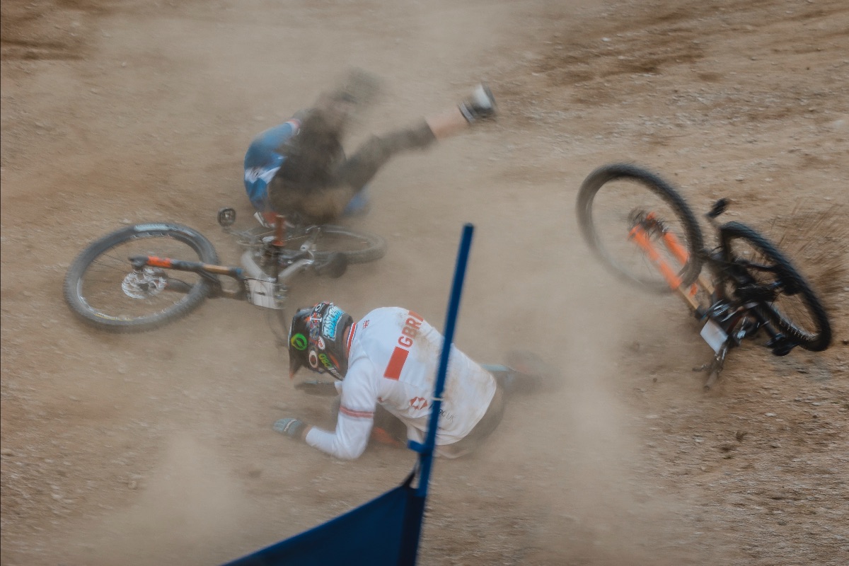After the first hour of practice Scott had his lines dialled. Passing places, and race plans were set. It was time for some gates. His first two looked on point. Really powerful and strong. Unfortunately it then went wrong. Lining up on gate 2, he made a good start but the rider on gate 4 made a great start. He then proceeded to cut across the front of Scott’s front wheel on the take off of the second jump. Scott crashed hard. Clearly in pain the medics were straight to him. It was his right elbow that was giving the most pain. Initially Scott got to his feet and walked off the track. It was then decided that he needed a doctor to examine him because the pain was increasing.